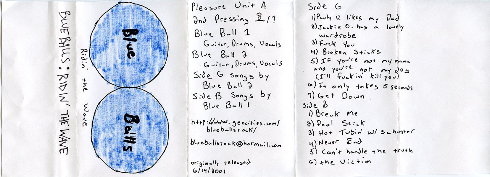 “The Blue Balls were conceived by Casey Buhr of the Strong Come Ons from Algoma. It was only Casey and Nick G for the first few tapes then Casey decided to franchise out the band. The only stipulation was that you had to get ordained, per se, by being in a Blue Balls with someone that was in the band before. Then you can franchise out to someone else afterward. One person plays drums and the other plays guitar on one side of the tape then you switch instruments on the other side. Everything has to be written and recorded, performed and released within a month. There was a drum restriction too… gotta have the minimal drum set up: snare, ride, floor tom, bass drum was it I believe. Numbering system and covers had to follow the format. All the tapes we did when we all moved to Milwaukee (essentially the ones that were on bible tapes) didn’t go through Casey and he allowed it to go out of his control. As long as the rules and concept are followed he doesn’t give a shit. Oh, and although it started out sounding garagey punky and many people chose to keep with that tradition, there really is no stylistic restriction.”