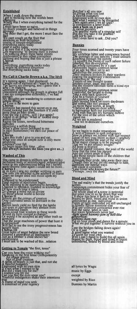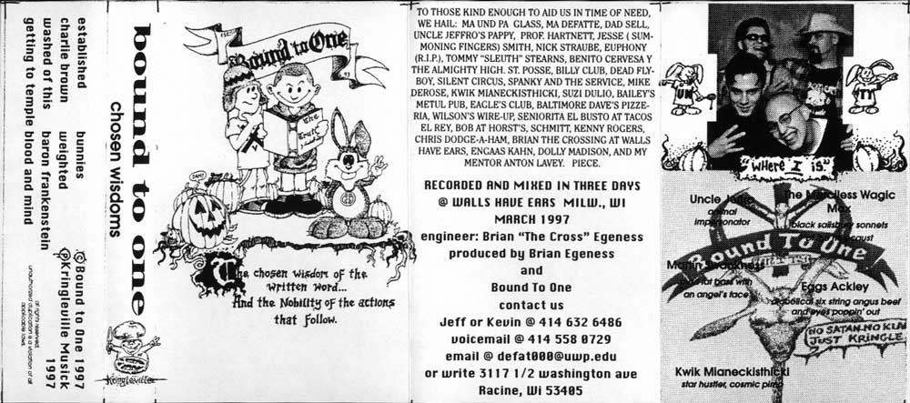 After a brief hiatus, Bound to One reformed, with one less guitarist and a new drummer. This demo was recorded at Walls Have ears in March of 1997. It was recorded and mixed in three days by Brian Egeness (Die Kreuzen).
