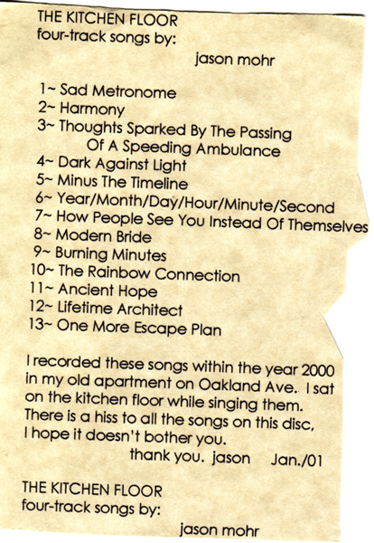 “I recorded these songs within the year 2000 in my old apartment on Oakland Ave. I sat on the kitchen floor while singing them. There is a hiss to all the songs on the disc, I hope it doesn’t bother you. thank you. Jason” From CD Insert