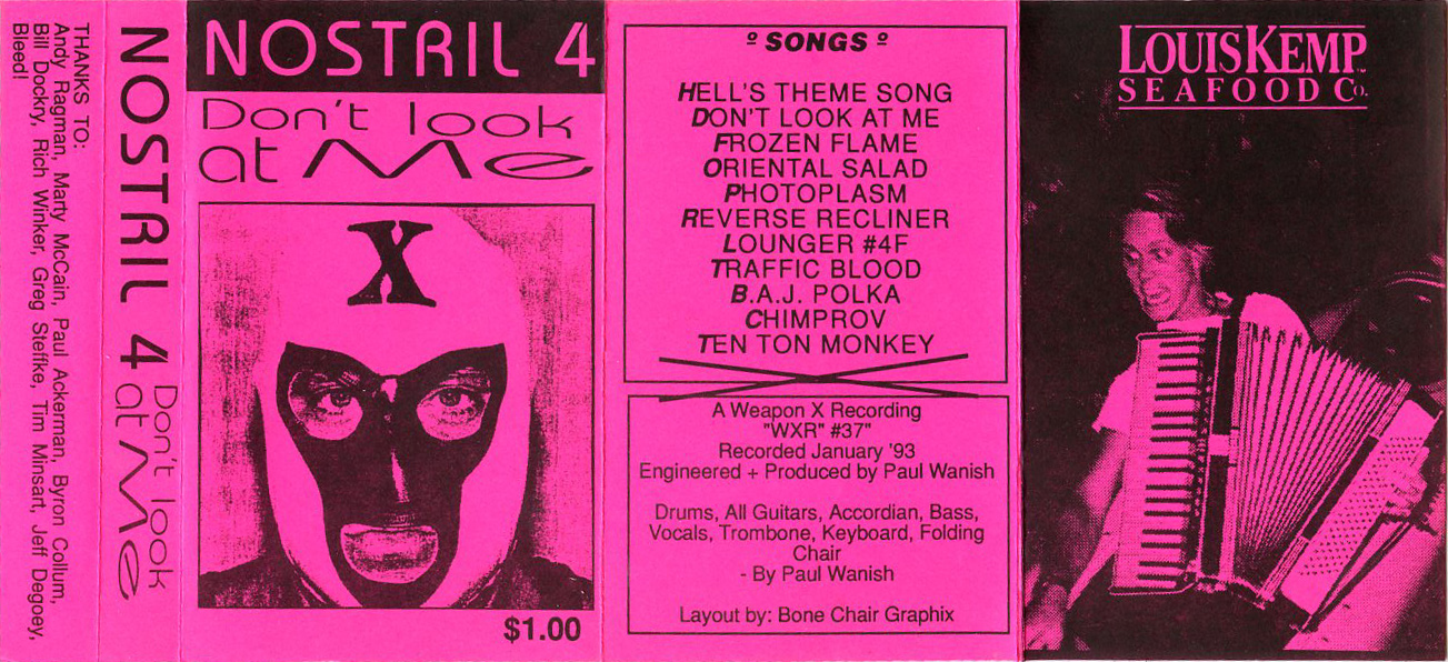 Tracks 1 through 12 are the actual “albumâ€, and the remaining “bonus tracks†were basically funny answering machine messages Paul got that month and then other Nostril recording projects, namely SNOWSHOVEL and TRAP VULVA.
