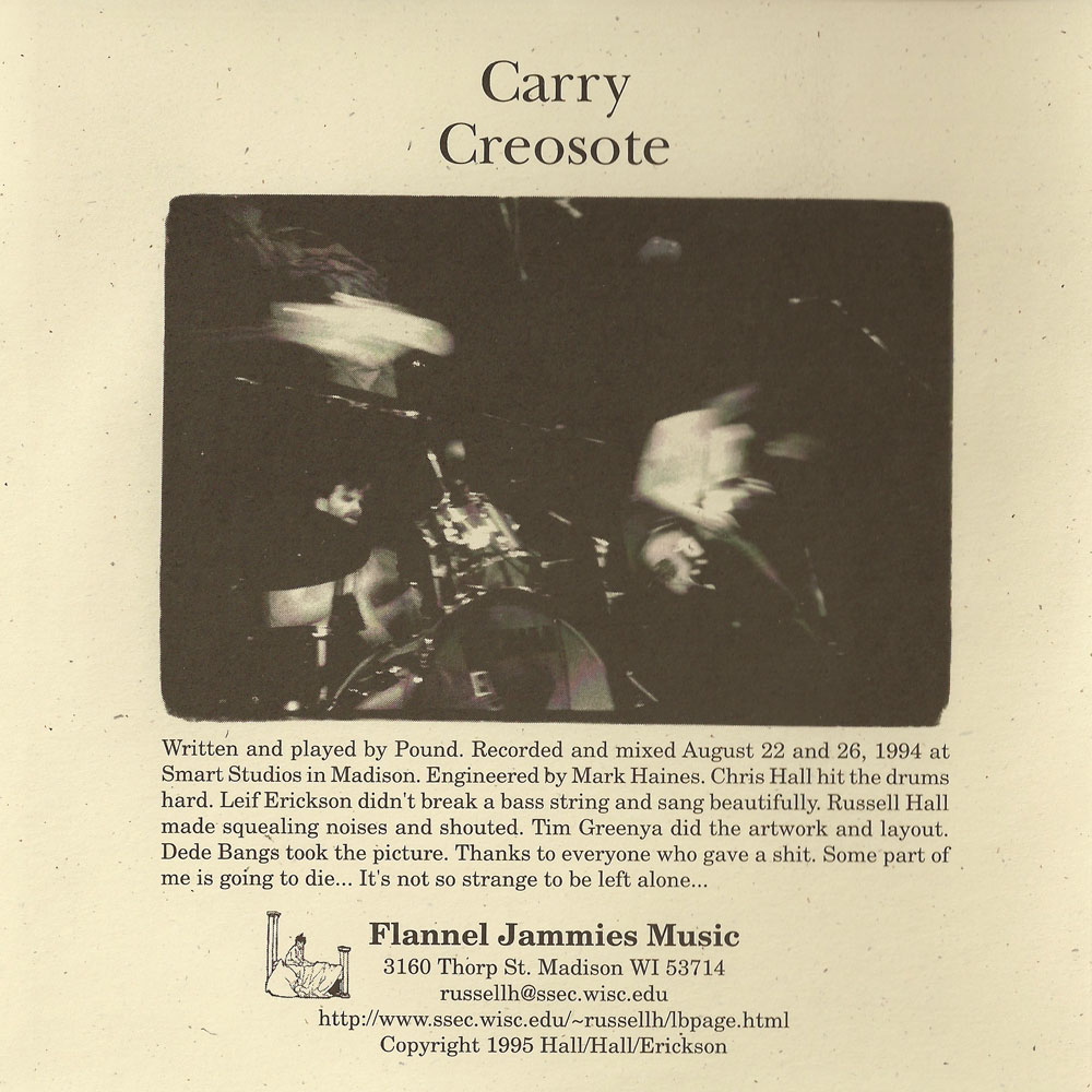Written and played by Pound. Recorded and mixed August 22 and 26, 1994 at Smart Studios in Madison. Engineered by Mark Haines. Chris Hall hit the drums hard. Leif Erickson didn’t break a bass string and sang beautifully. Russell Hall made squealing noises and shouted. Tim Greenya did the artwork and layout. Dede Bangs took the picture. Thanks to everyone who gave a shit. Some part of me is going to die… It’s not so strange to be left alone